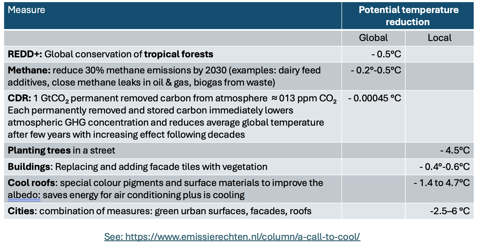 For example greening EU’s urban areas would reduce urban summer temperatures by 2.5–6°C; the pledged 30% reduction of methane limits temperature already with 0.2°-0.5° C